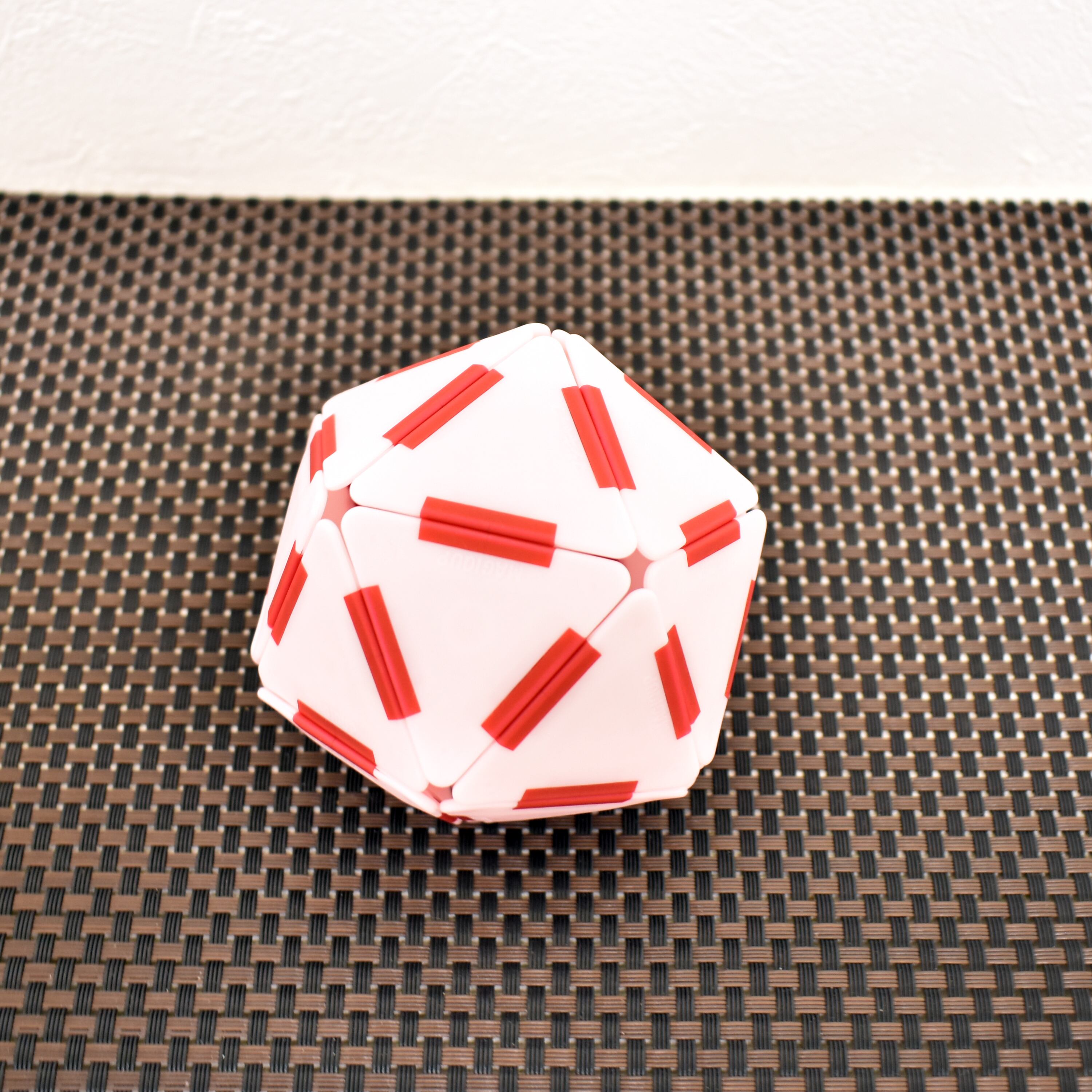 辺の長さの等しい4種類の正多角形(三、四、五、六角形)プレートには、各辺前縁中央部に極性が反転する丸棒磁石が埋め込まれています。