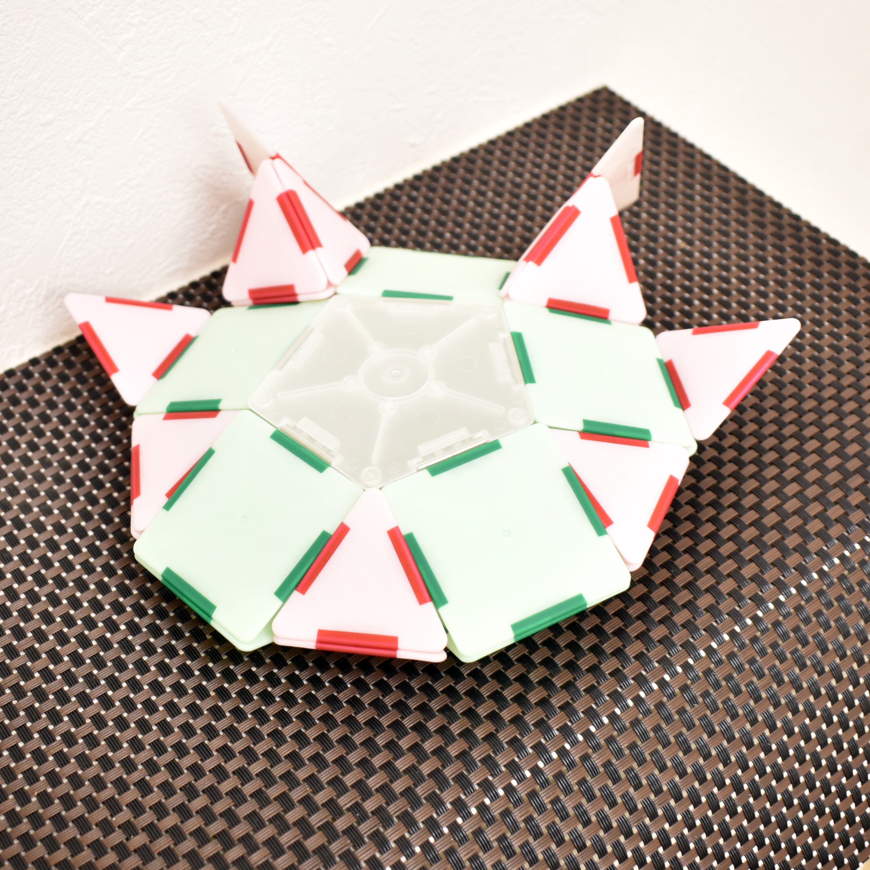 辺の長さの等しい4種類の正多角形(三、四、五、六角形)プレートには、各辺前縁中央部に極性が反転する丸棒磁石が埋め込まれています。